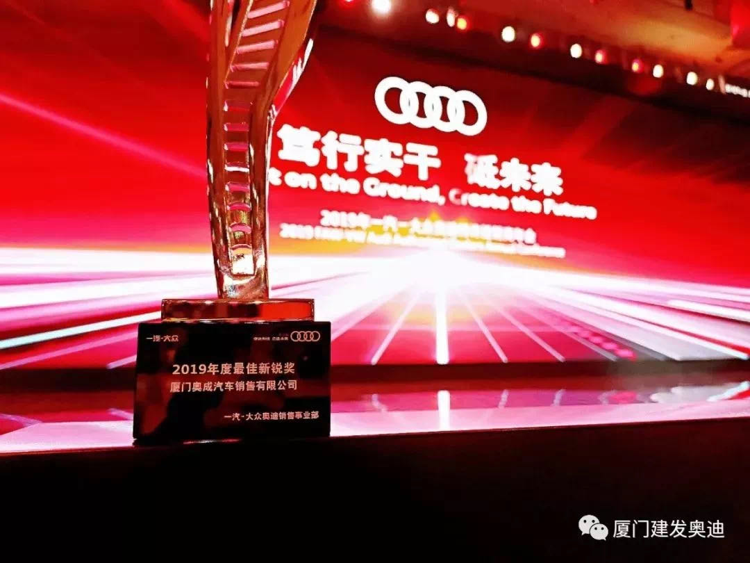 在“笃行实干 砥未来”——2019一汽-大众奥迪特许经销商年会上,奥迪厂家对2019年各地取得优异成绩的经销商进行了表彰。厦门建发奥成奥迪开业不到半年,秉承着奥迪“突破科技,启迪未来”及建发汽车“专业对车,诚以待人”的理念,在各方面取得巨大的突破,得到奥迪厂家的充分肯定,荣获一汽-大众奥迪“2019年度最佳新锐奖”,是本次厦门地区唯一获得团体荣誉的经销商。